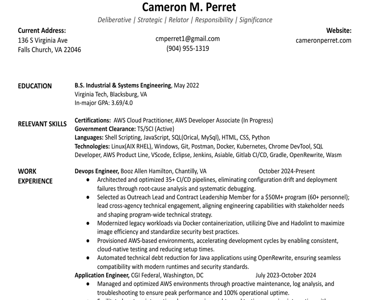 I'm a DevOps Engineer at Booz Allen Hamilton, currently based in Falls Church, Virginia. I have over 3 years of experience building and automating software systems for both clients and personal projects.